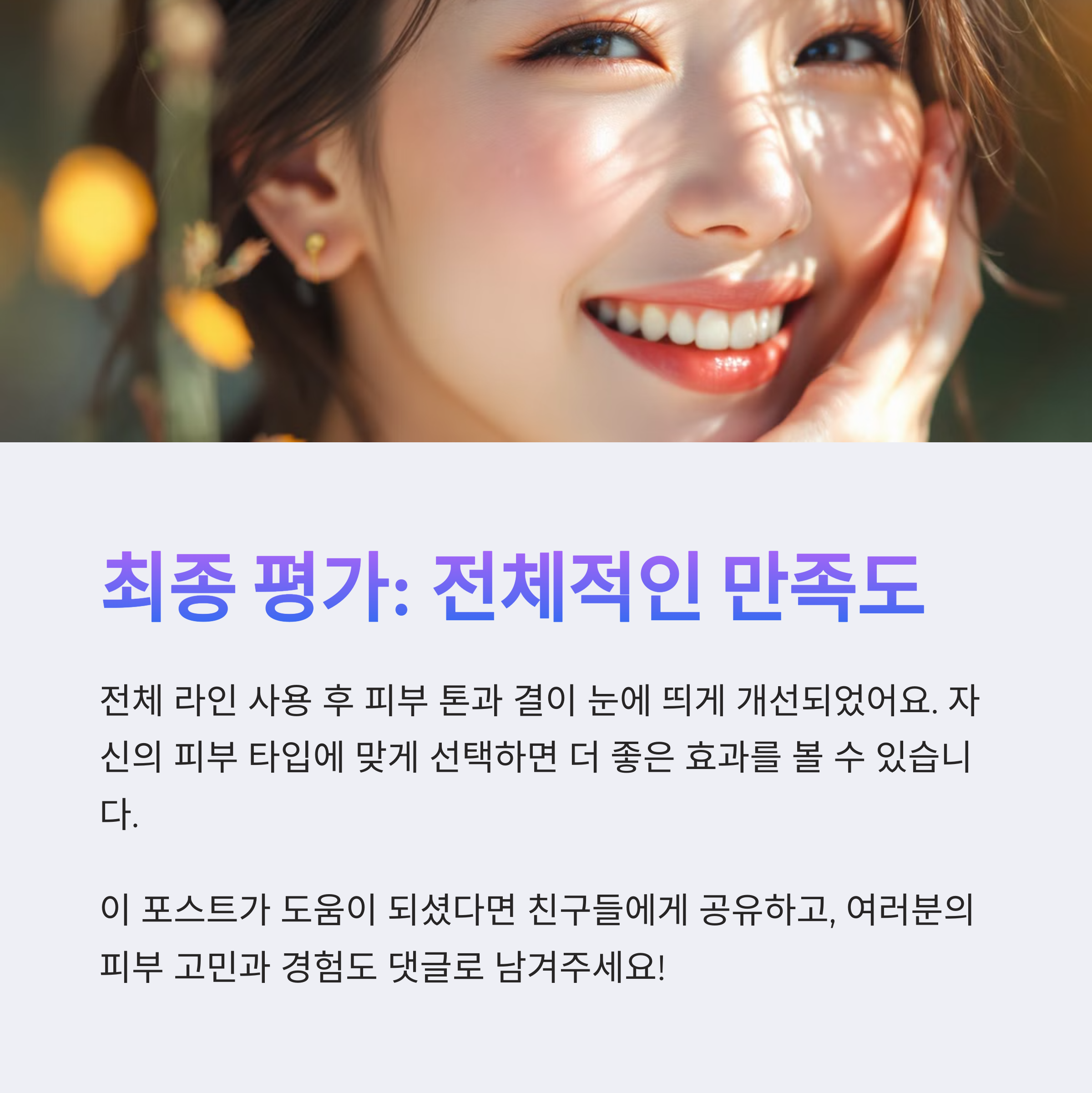 스킨부터 톤업까지 전 라인 사용은 단순한 제품 리뷰를 넘어 피부와 제품 간 궁합을 알아보는 좋은 기회였습니다. 각각의 제품은 혼자보다는 함께 사용할 때 더 높은 만족도를 보여주었고, 민감한 피부에도 잘 맞아 안정적으로 루틴을 완성할 수 있었어요. 물론 모든 피부에 동일한 효과를 보장할 순 없지만 저처럼 고민이 많았던 분들께 하나의 기준이 될 수 있기를 바랍니다.