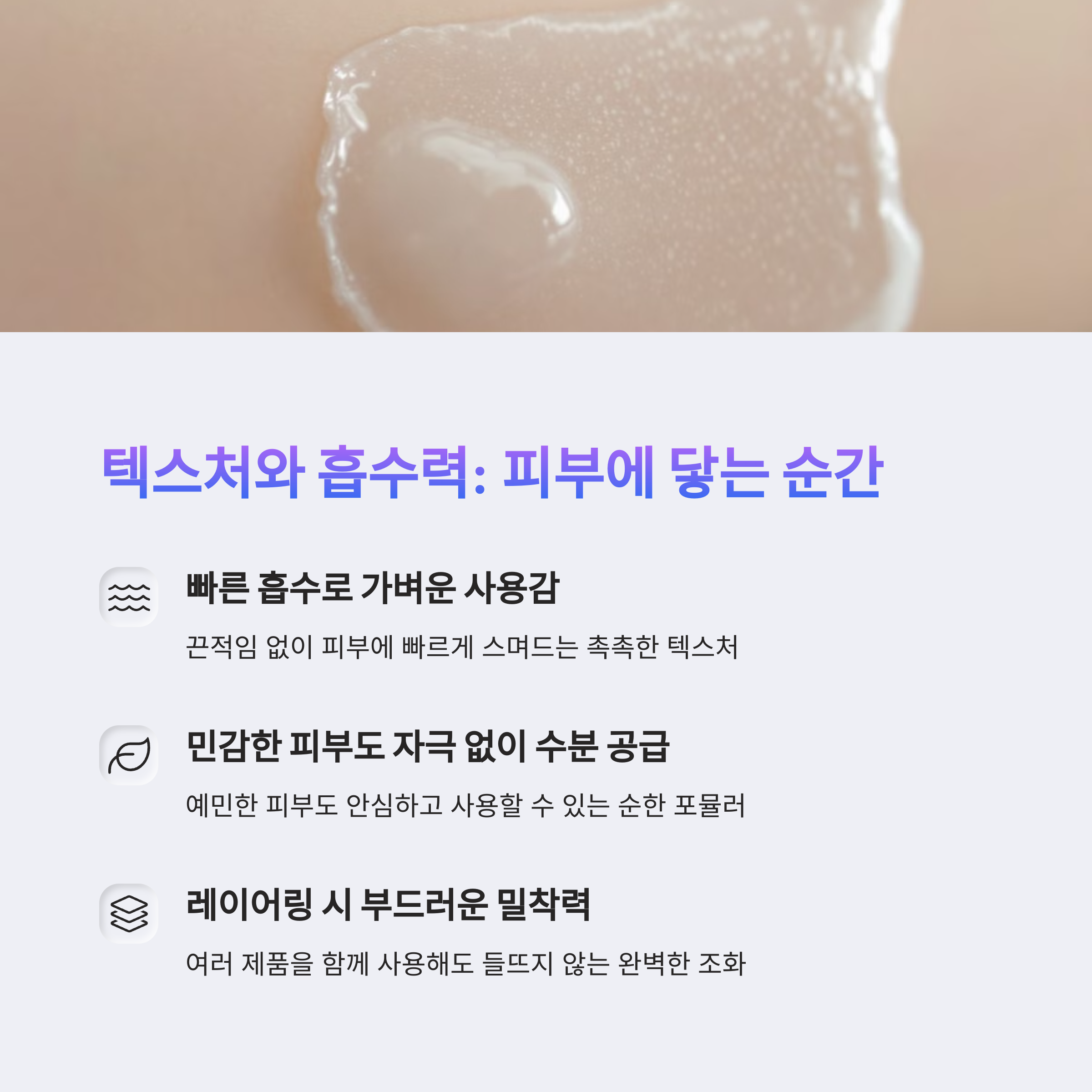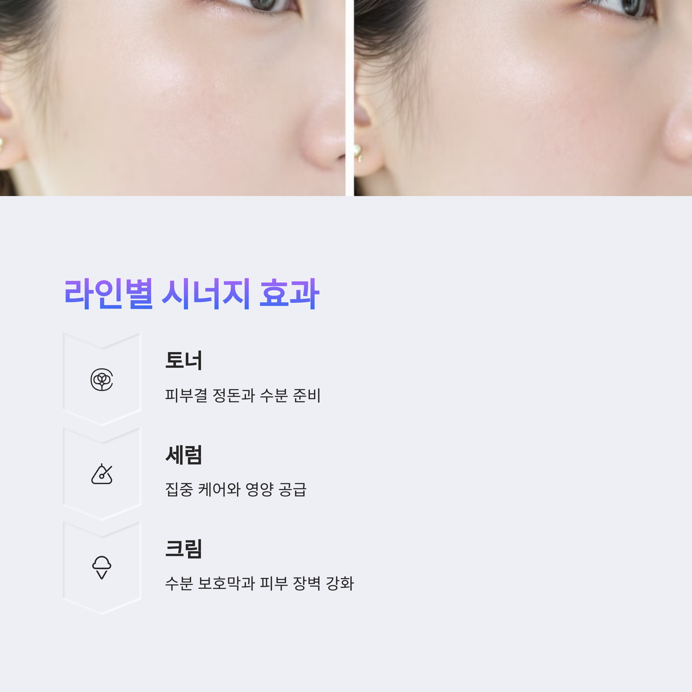 | 제품 간 텍스처 궁합이 좋음 | 사용 순서대로 흡수가 빠르고 자연스러움 | 예민한 피부도 순하게 사용할 수 있는 포뮬라 |