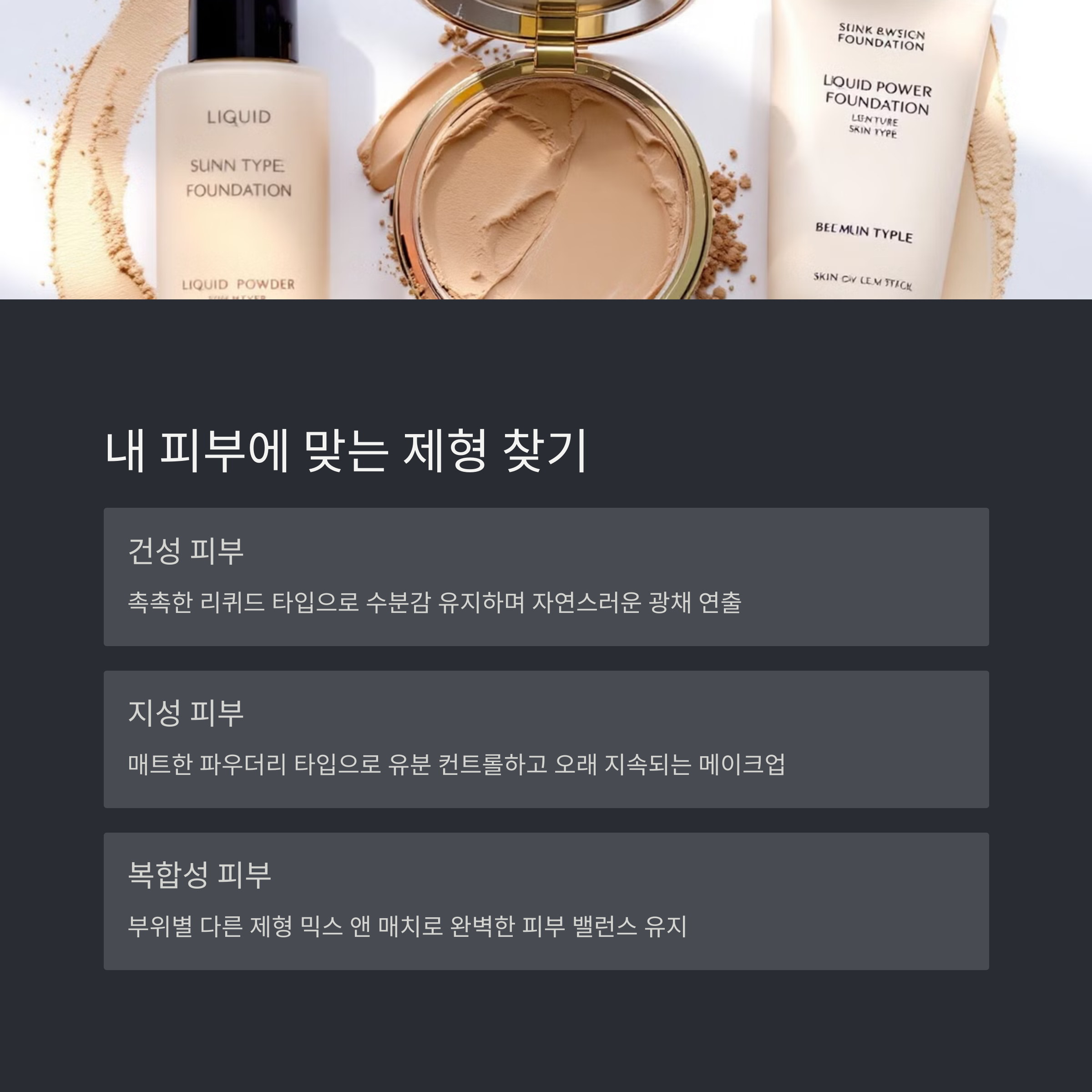 햇살에서도 무너지지 않는 커버력 필요 | 내 피부에 맞는 컬러 선택이 핵심 | 얇게 밀착되며 들뜸 없는 텍스처 |