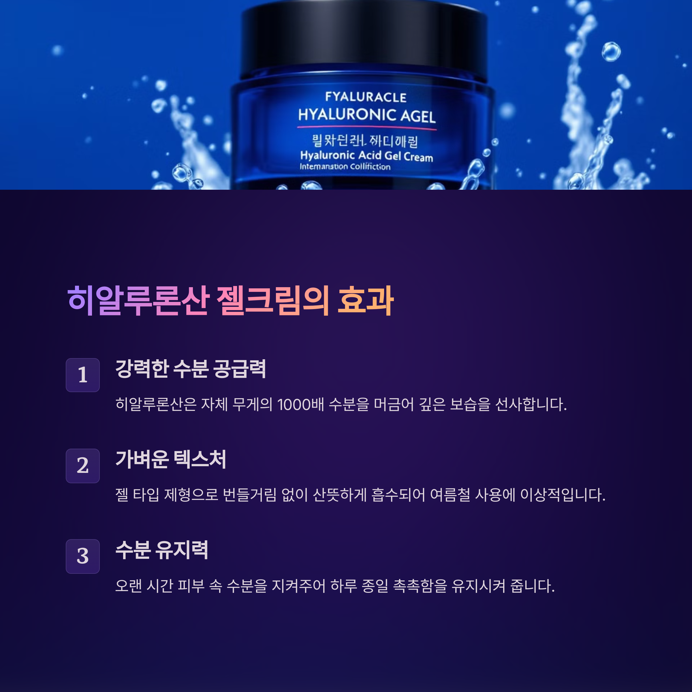 | 히알루론산 기반의 산뜻한 수분 공급 | 알로에, 병풀 등 여름 진정 성분 함유 | 무향료, 무알콜로 민감성 피부에도 안전 |