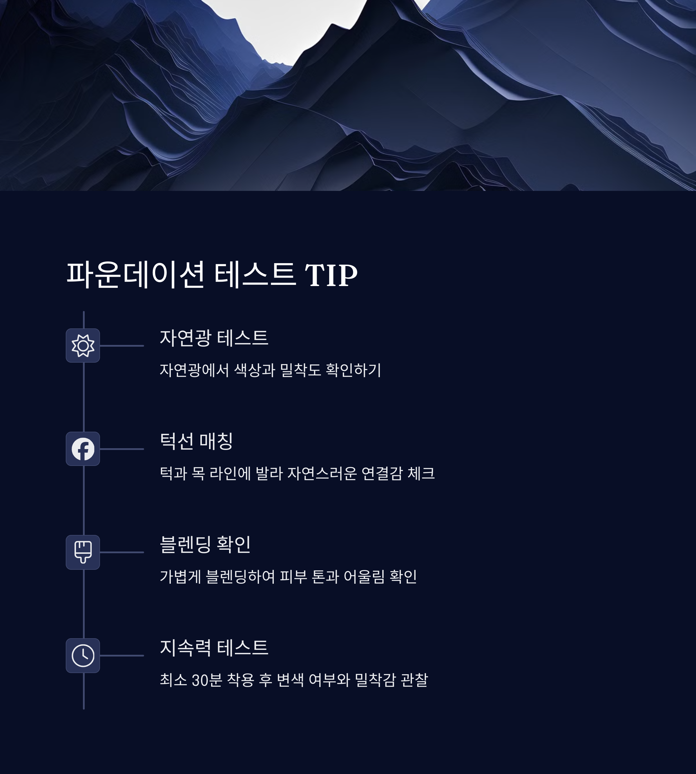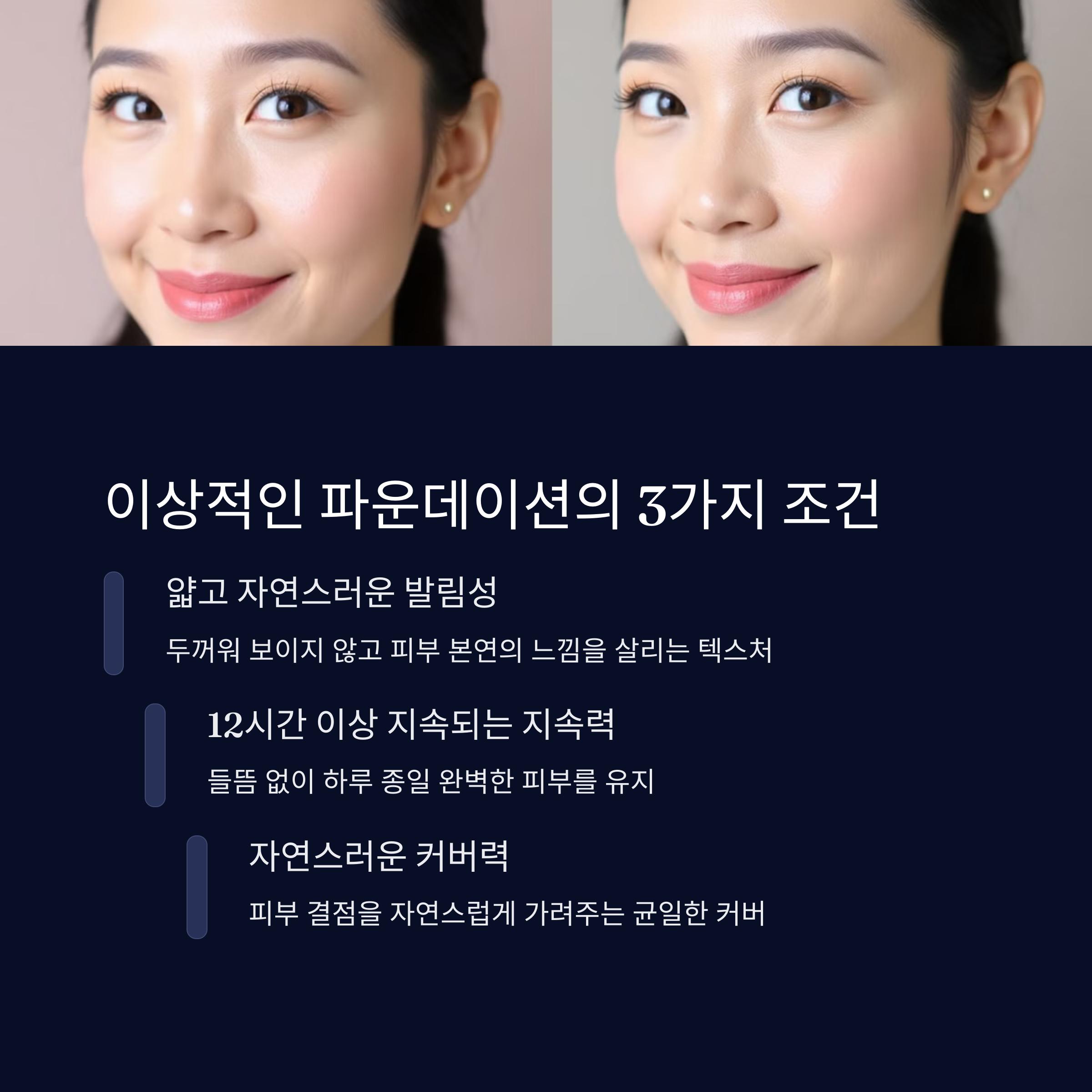 밀착력 좋은 파운데이션의 공통점은 제형의 얇음, 유분과 수분의 균형, 피부 타입에 맞는 선택입니다. 모든 제품이 모든 피부에 맞을 수는 없기 때문에 직접 테스트를 통해 자신에게 가장 잘 맞는 밀착력 중심의 파운데이션을 찾는 것이 중요해요. 브랜드의 광고보다 더 중요한 건 내 피부와의 궁합입니다.