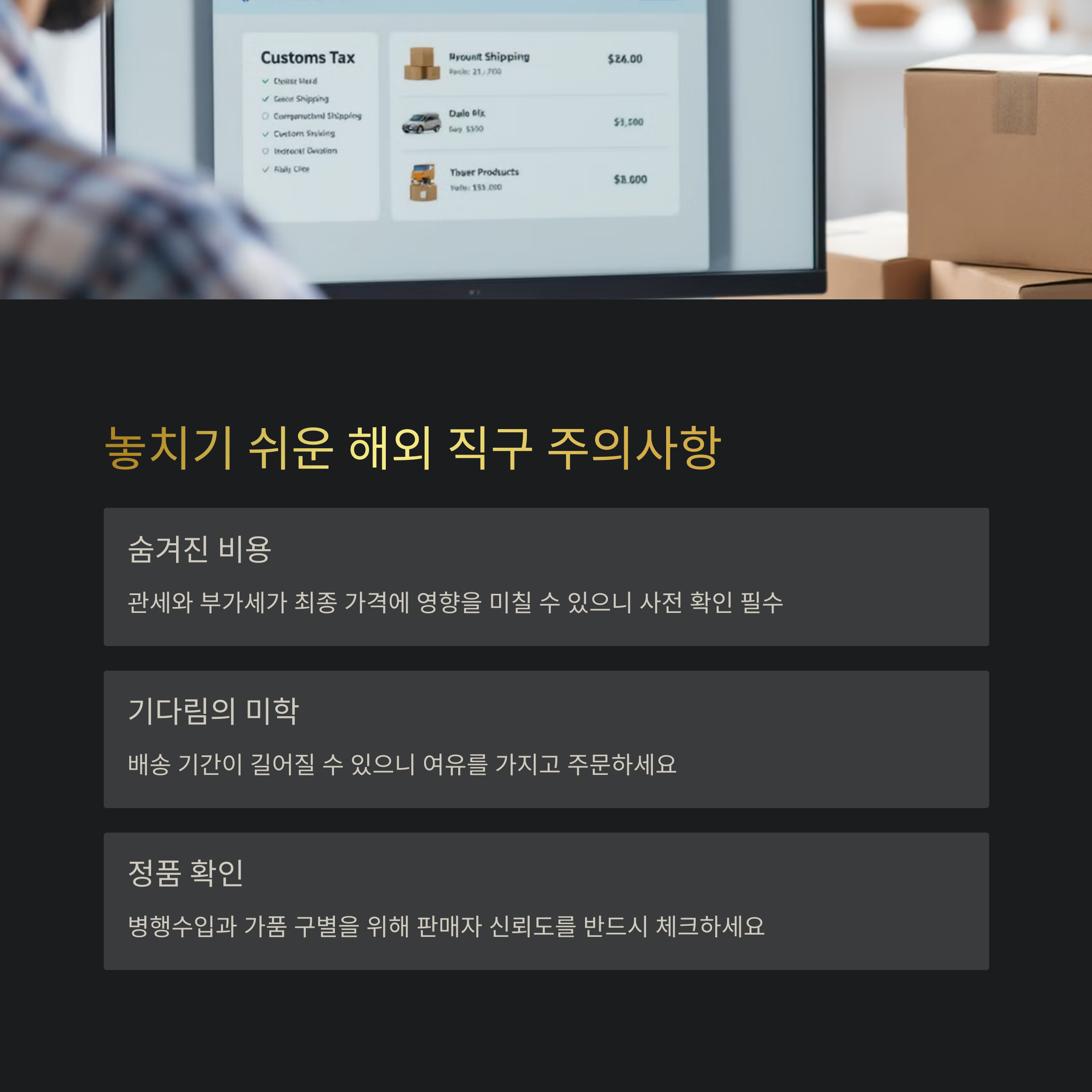 | 유의사항 | 관세, 배송 기간, 정품 여부 확인은 필수 |
