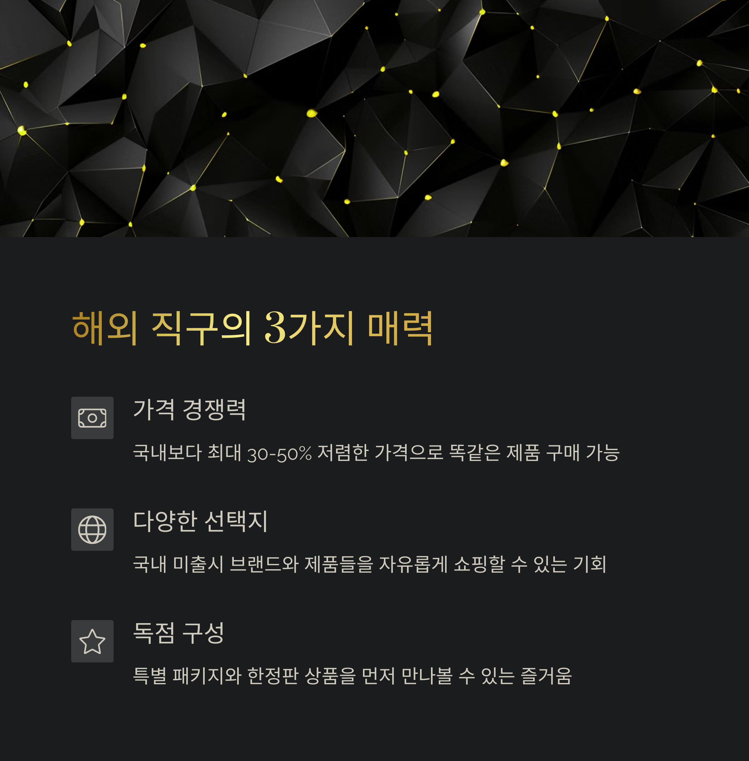 | 직구 장점 | 한국보다 저렴하거나 독점 상품을 구입할 수 있음 |