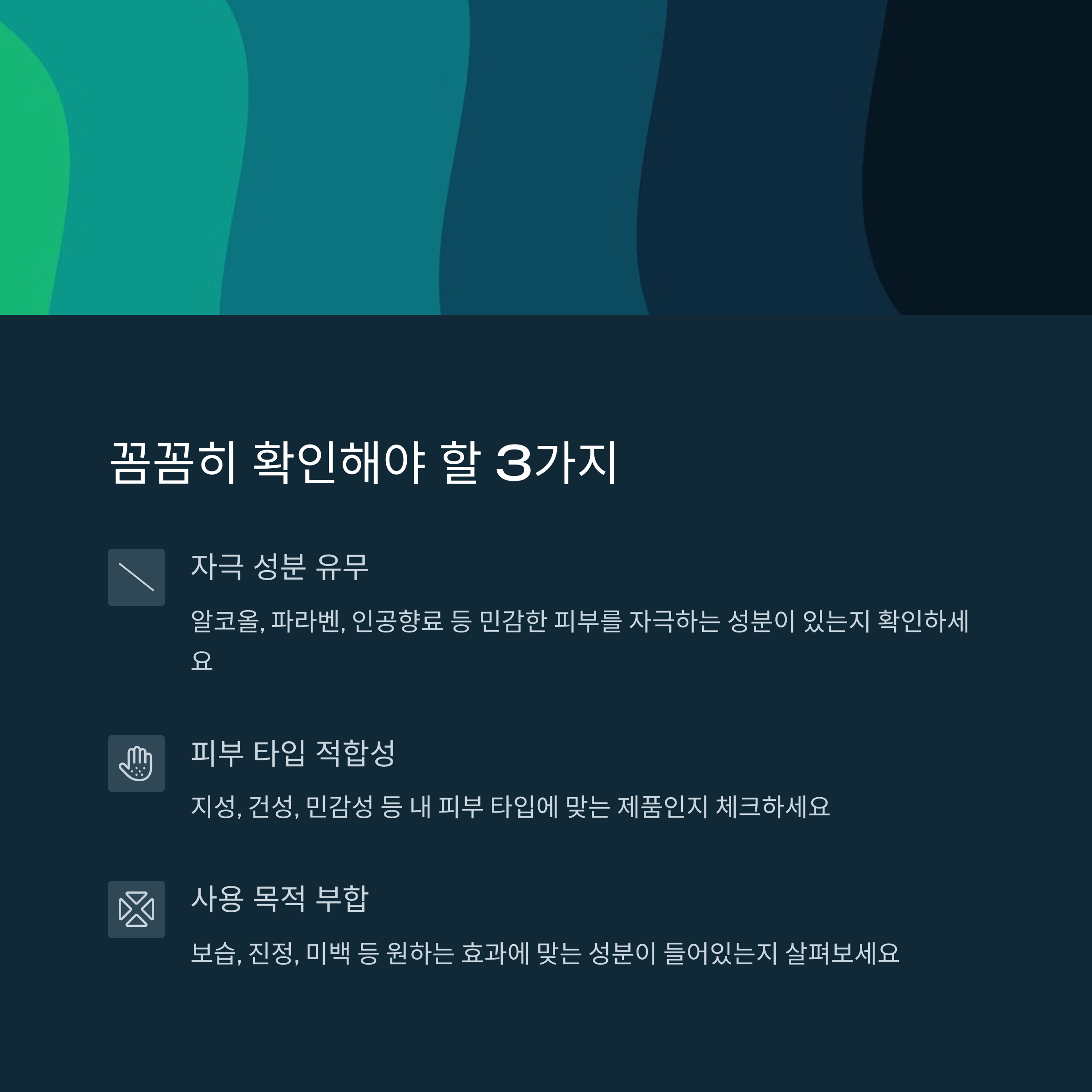 | 피부 맞춤 | 성분과 피부 타입의 궁합이 가장 중요해요. |