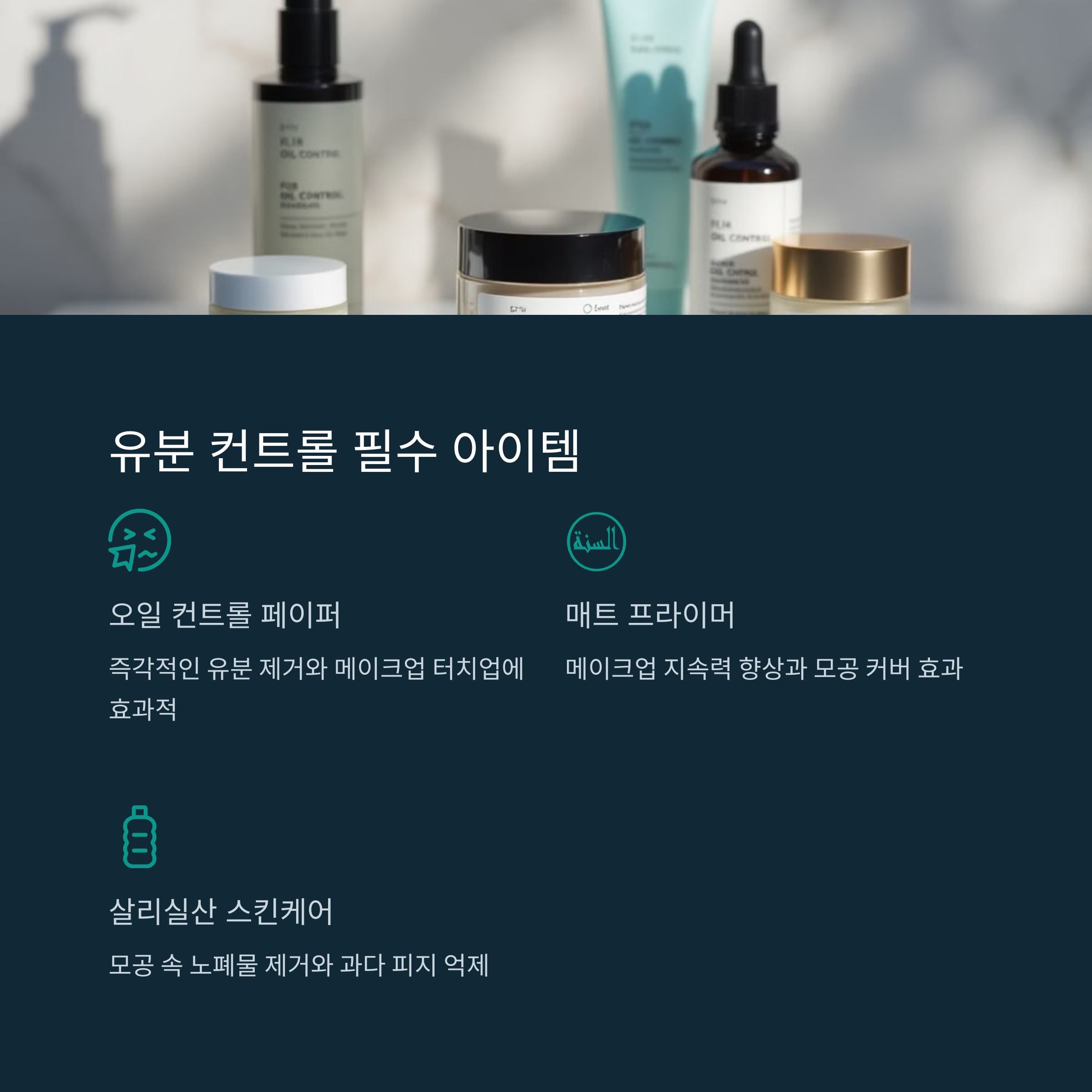 | 오일 페이퍼, 프라이머, 유분조절 세럼 | 수분 충전 후 유분 정돈이 핵심 | 유분 컨트롤이 메이크업 지속력 좌우 |