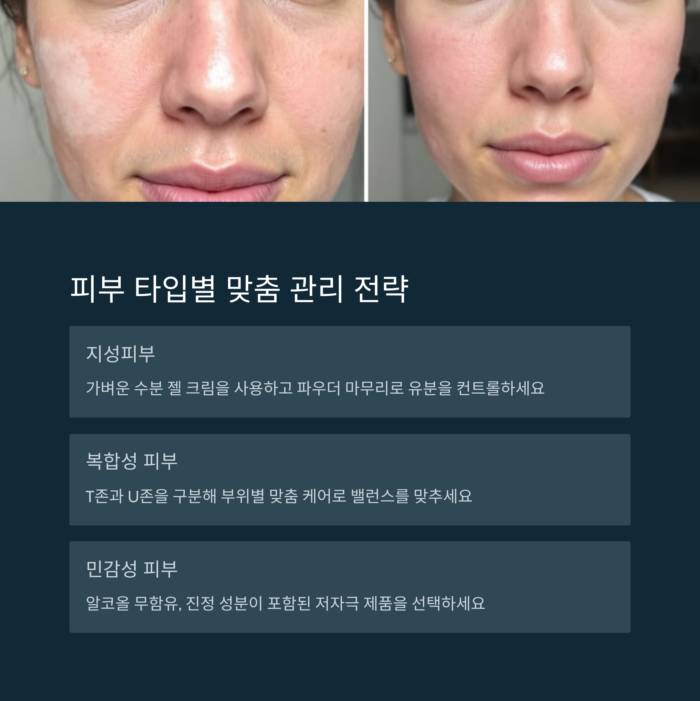 유분기를 잘 잡아주는 스킨케어 루틴도 중요한데요, 토너 → 세럼 → 유분조절 크림의 순서로 제품을 구성하고, 유수분 밸런스를 맞춰주는 성분이 들어간 제품을 사용하는 것이 효과적입니다. 과도하게 유분을 제거하기보다는, 수분을 채워서 자연스럽게 피지 분비를 안정시키는 방향으로 관리하는 것이 피부 건강에 훨씬 긍정적이에요. 일시적인 효과보다 지속 가능한 컨디션 유지가 핵심입니다.