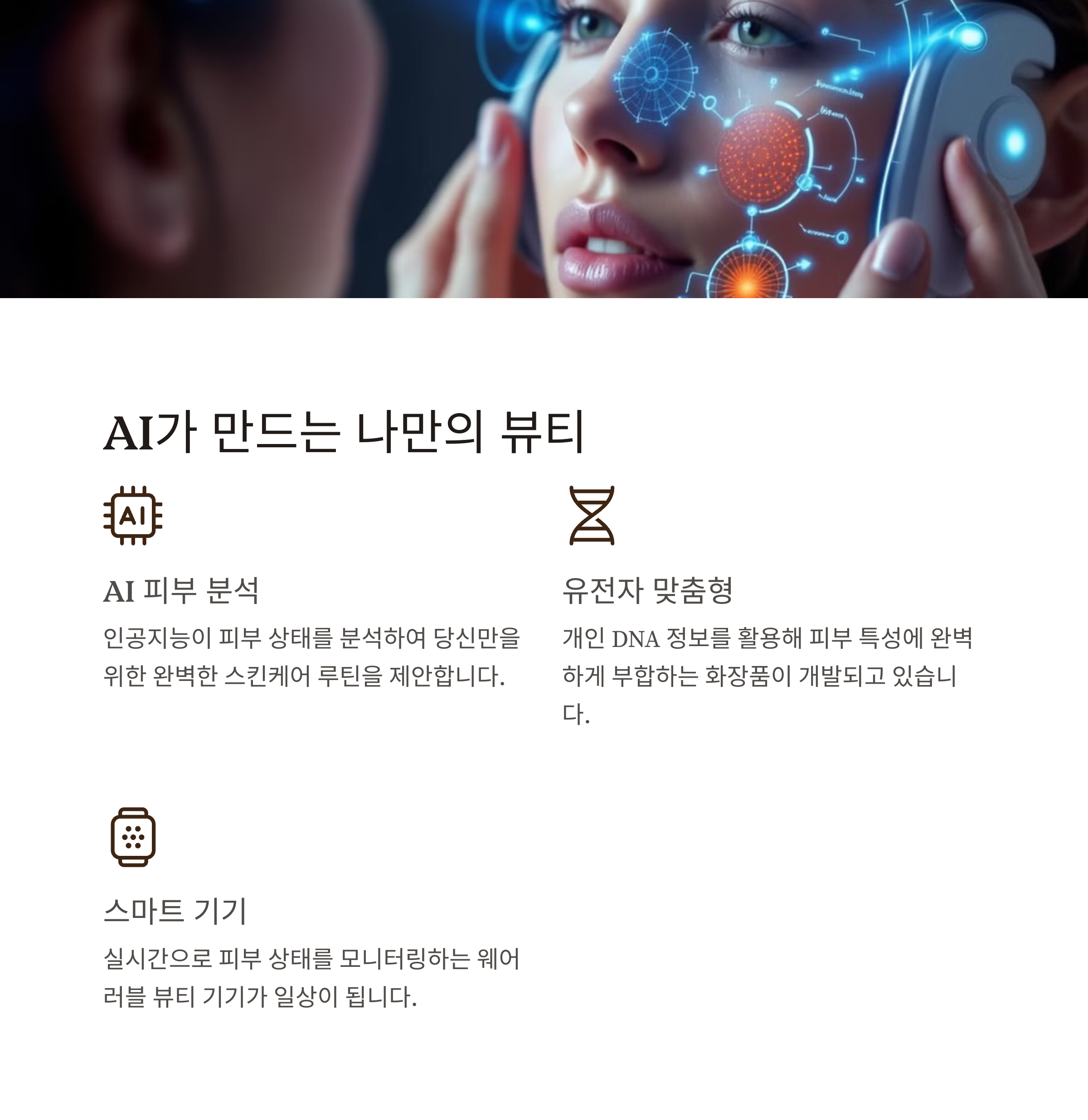 또 하나의 큰 흐름은 개인 맞춤형 뷰티입니다. AI 기술을 활용한 피부 진단, 나에게 맞는 컬러나 성분을 기반으로 한 화장품 추천 등, 테크 기반 퍼스널 뷰티 솔루션이 점점 보편화되고 있습니다. 이는 단순한 편의성을 넘어, 진정한 나만의 뷰티를 찾는 데 큰 역할을 하고 있습니다. 하이브리드 뷰티 디바이스도 그 흐름에 맞춰 빠르게 확산되고 있어요.