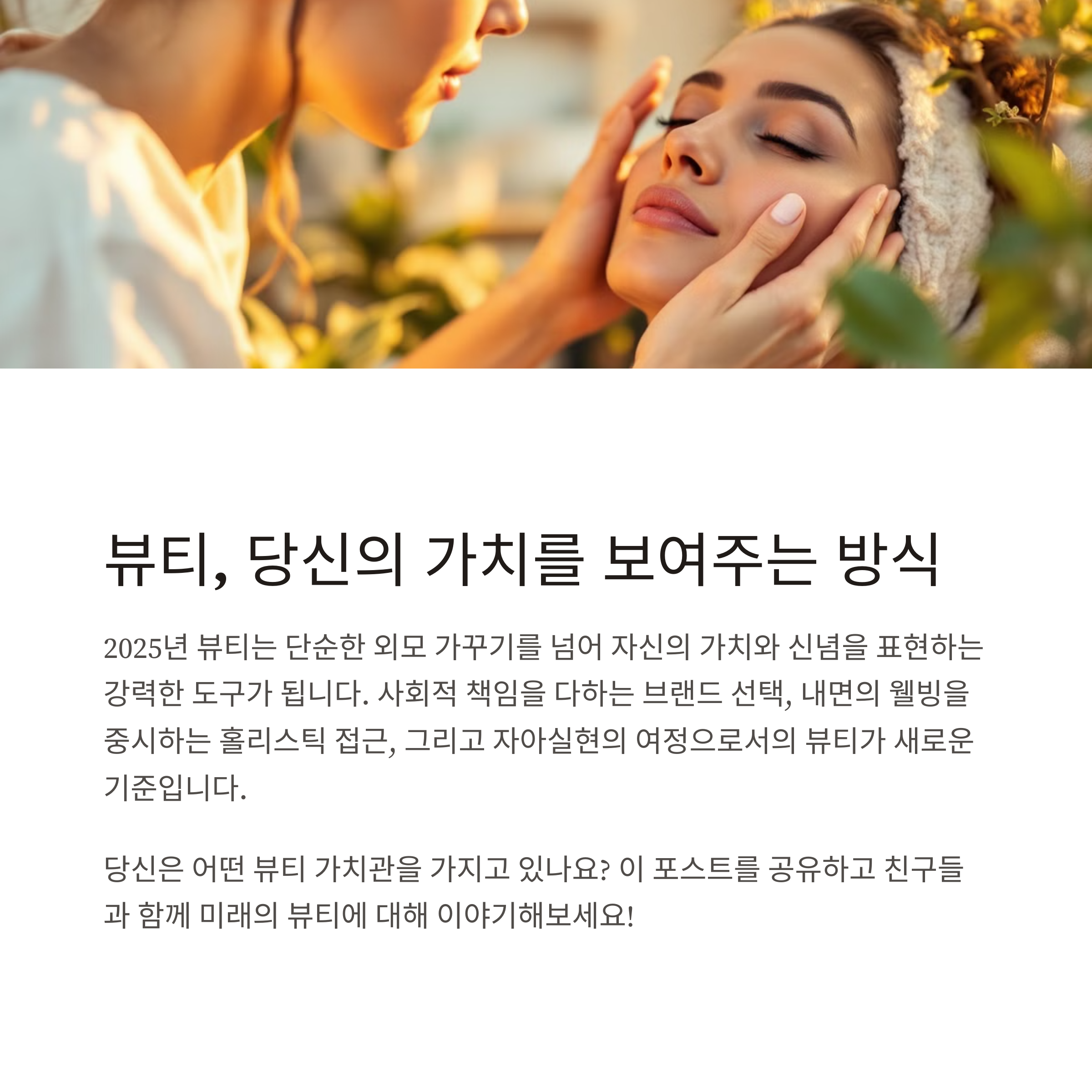2025년 뷰티는 더욱 개인화되고 철학 있는 소비로 전환되고 있습니다. 단순히 좋은 화장품을 넘어, 나를 표현하고, 환경과 사회까지 생각하는 지속 가능한 뷰티가 중심이 되었죠. AI 기술의 도입과 젠더리스 문화의 확산은 또 다른 흐름을 만들어내며, 모든 사람이 자신만의 뷰티를 존중받는 시대를 여는 원동력이 되고 있습니다. 지금, 나만의 진짜 아름다움을 정의해보세요.