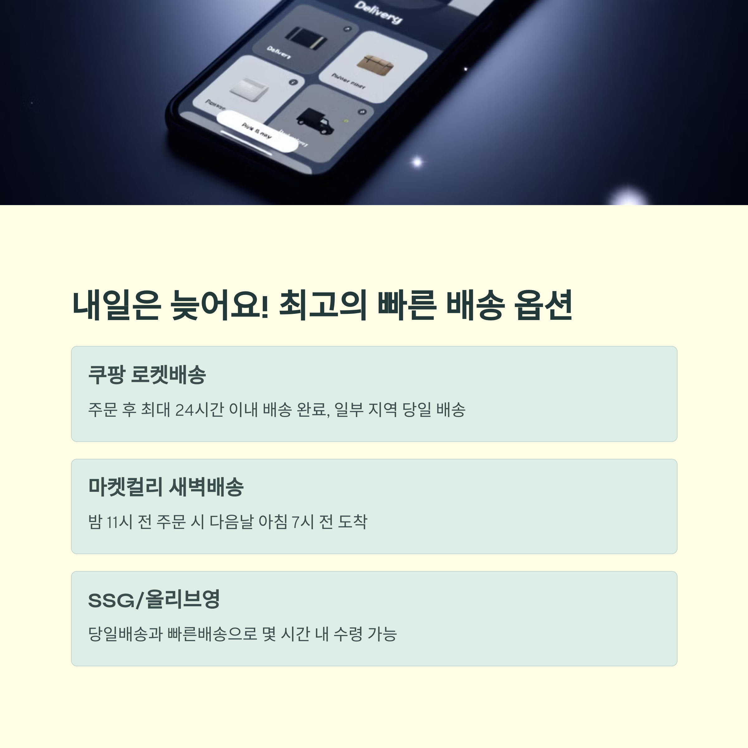 | 쿠팡, 로켓프레시, 빠른 출고 품목 다양 | 마켓컬리, 헬로네이처 등 이른 아침 배송 가능 | SSG, 올리브영, 현대식품관 등 수도권 중심 |