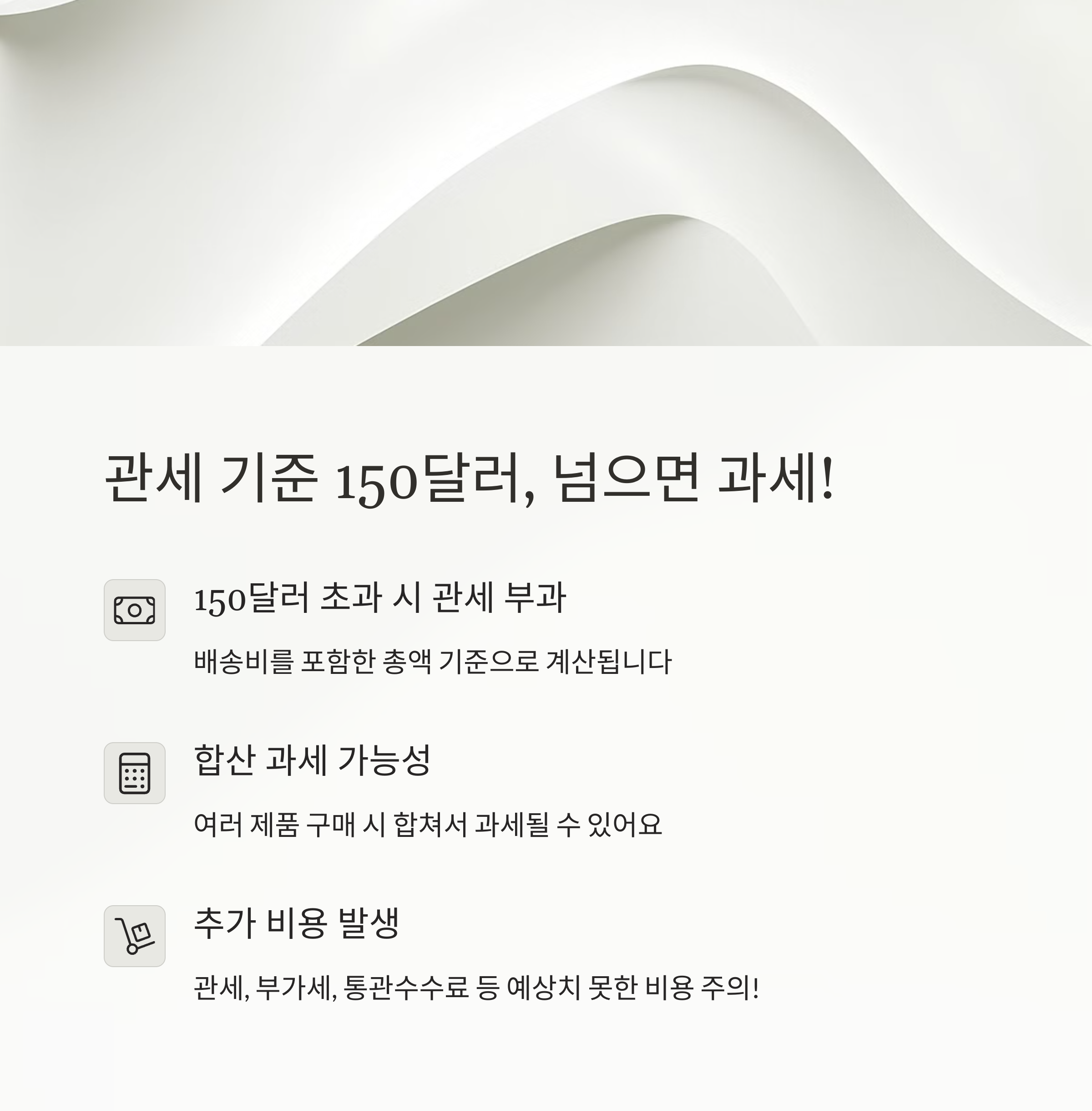 | 150달러 초과 시 관세 발생 | 병행수입·리퍼 제품 주의 | 세관검사 및 A/S 불가 가능성 |