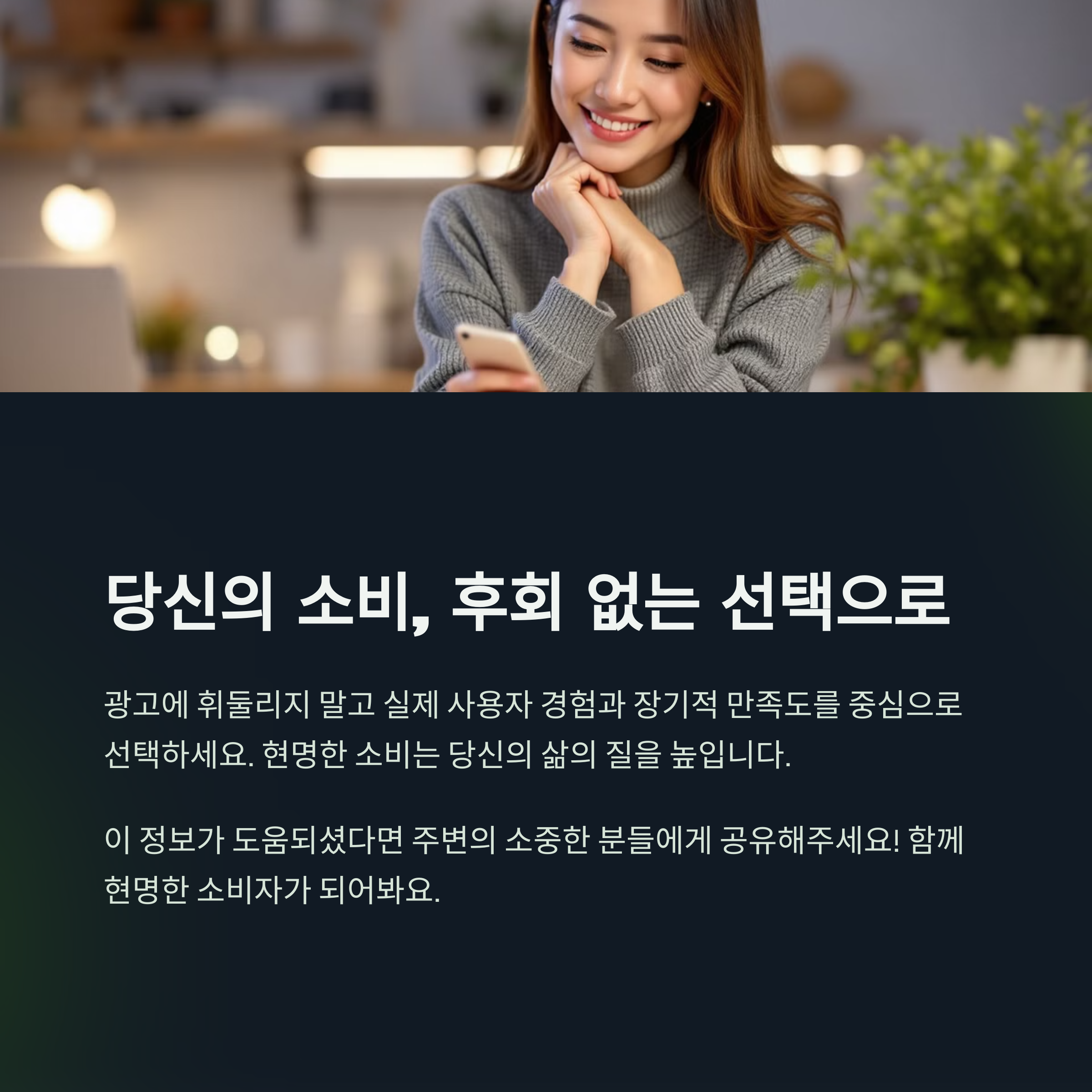 | 구매 후 남긴 리뷰가 구매 결정에 큰 영향 | 오랜 기간 사용해도 만족스러운 제품 | 다시 찾게 되는 제품은 신뢰도 높음 |