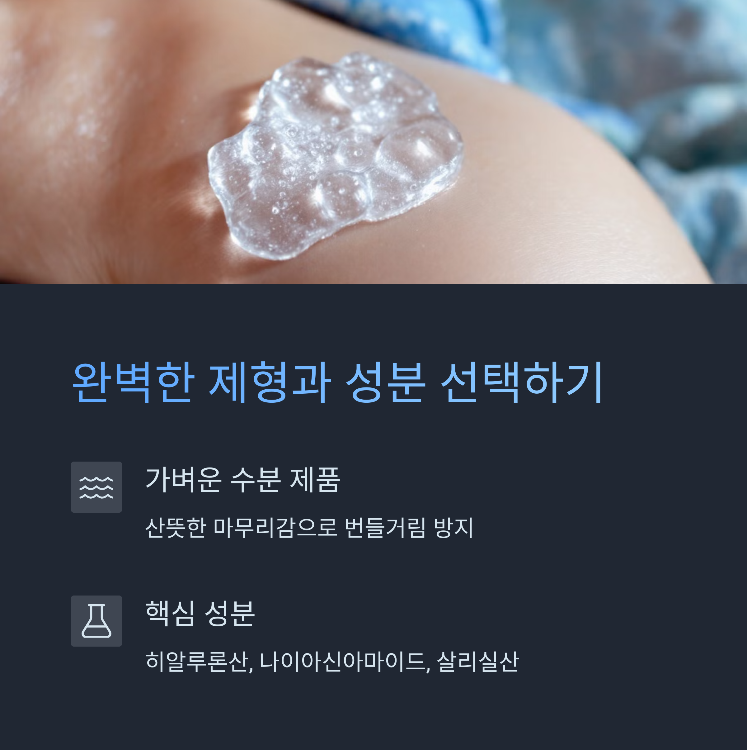 | 화장품 선택 기준 | 유분기 적고 흡수가 빠른 제품을 사용하는 것이 좋다 |